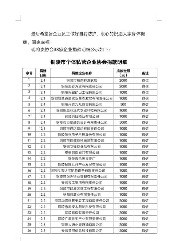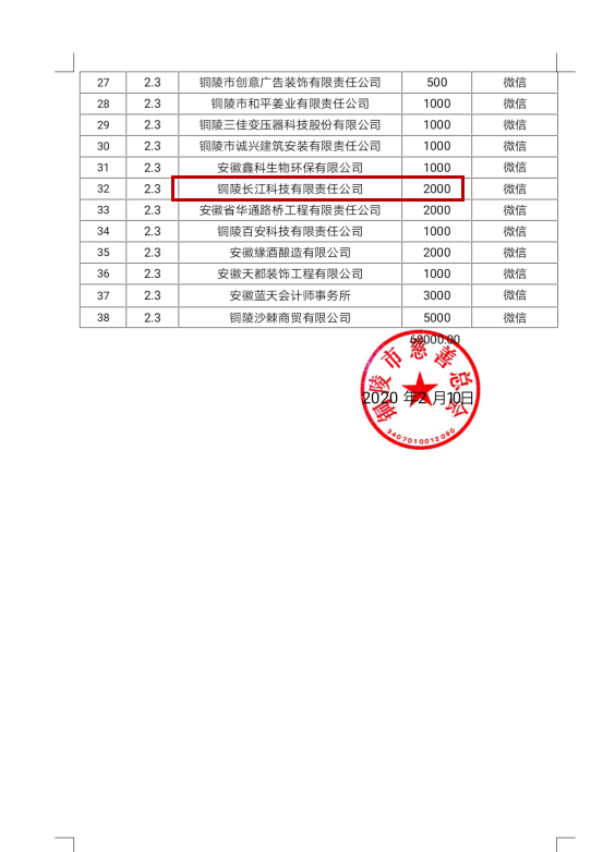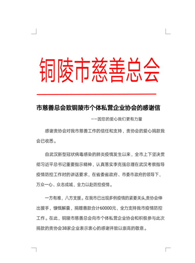 在新型冠状病毒感染的肺炎疫情防控期间,我公司作为铜陵市个私企业协会成员单位,积极响应号召,向铜陵市慈善总会捐赠善款,为支持我市疫情防控工作贡献了一份微博的力量。受到铜陵市慈善总会的表扬。