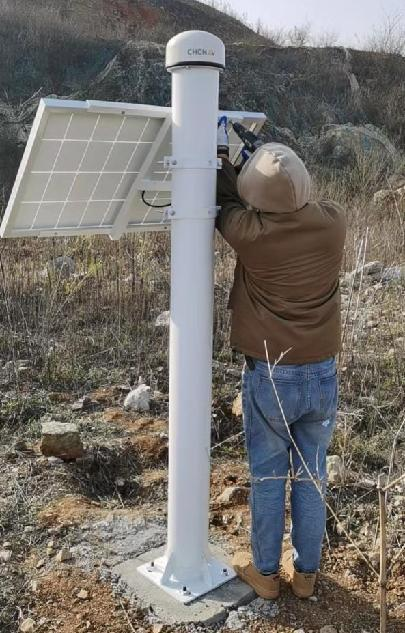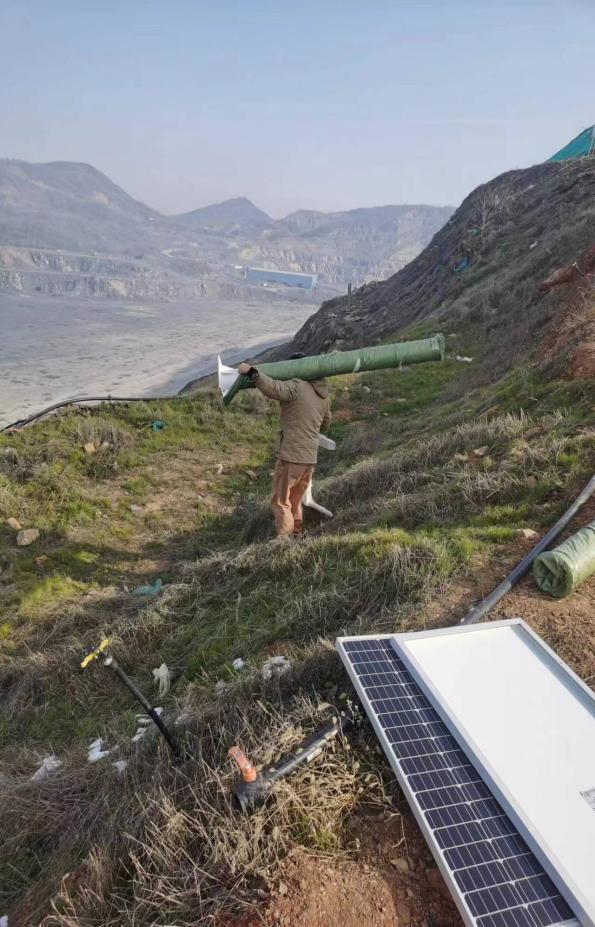 该地地处矿区深处、路况复杂,载具无法上山,材料靠人力运输,给施工带来了不小的困难,但凭借意志与配合,我公司技术人员将难点一一克服,成功在规划位置预埋好10套立杆杆件、卫星测量设备、物联网、太阳能供电设备等,都如期安装就位。